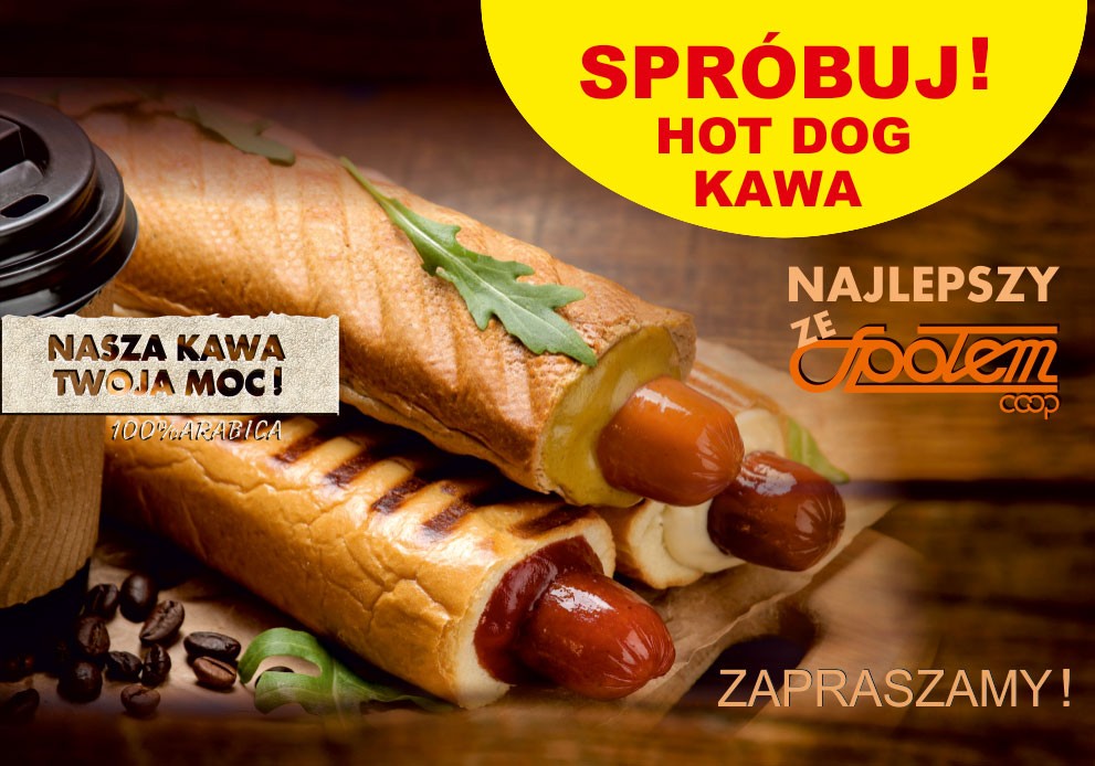 Spragniony, a może głodny? Już dziś wpadnij do Nas, na kawę lub Hot Doga! Specjalnie dla Ciebie do wyboru różne rodzaje kaw, a także pyszne Hot Dogi z parówką lub kabanosem i rozmaitymi sosami. Kupisz w wybranych sklepach Społem!